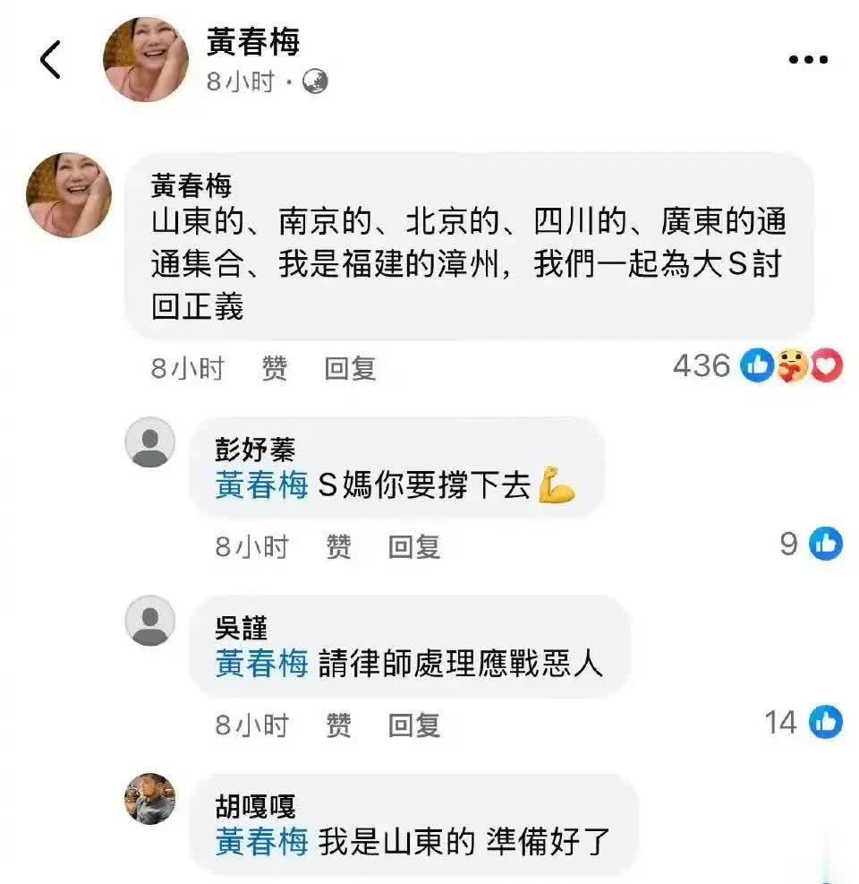 此前,S 妈曾发文为大 S 讨回正义,疑似喊话汪小菲,号召各地粉丝助力,为大S讨回正义。
